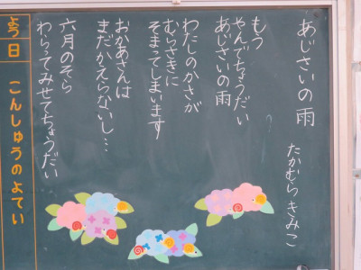 教室の背面黒板の詩も、梅雨時期を感じます。